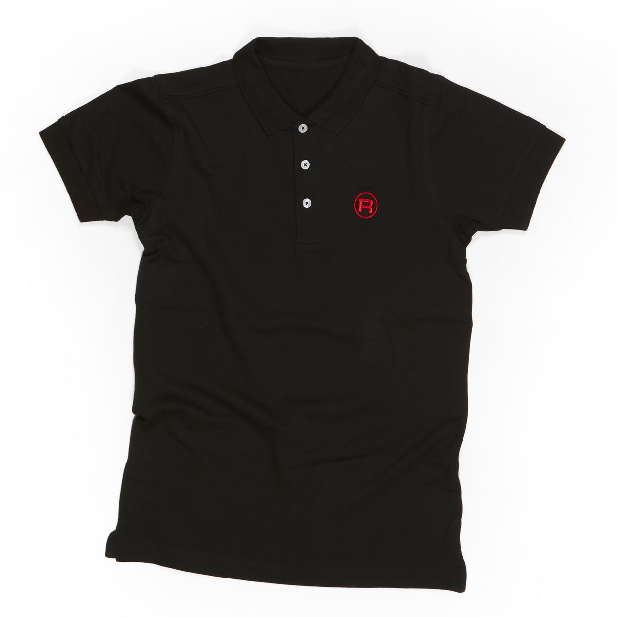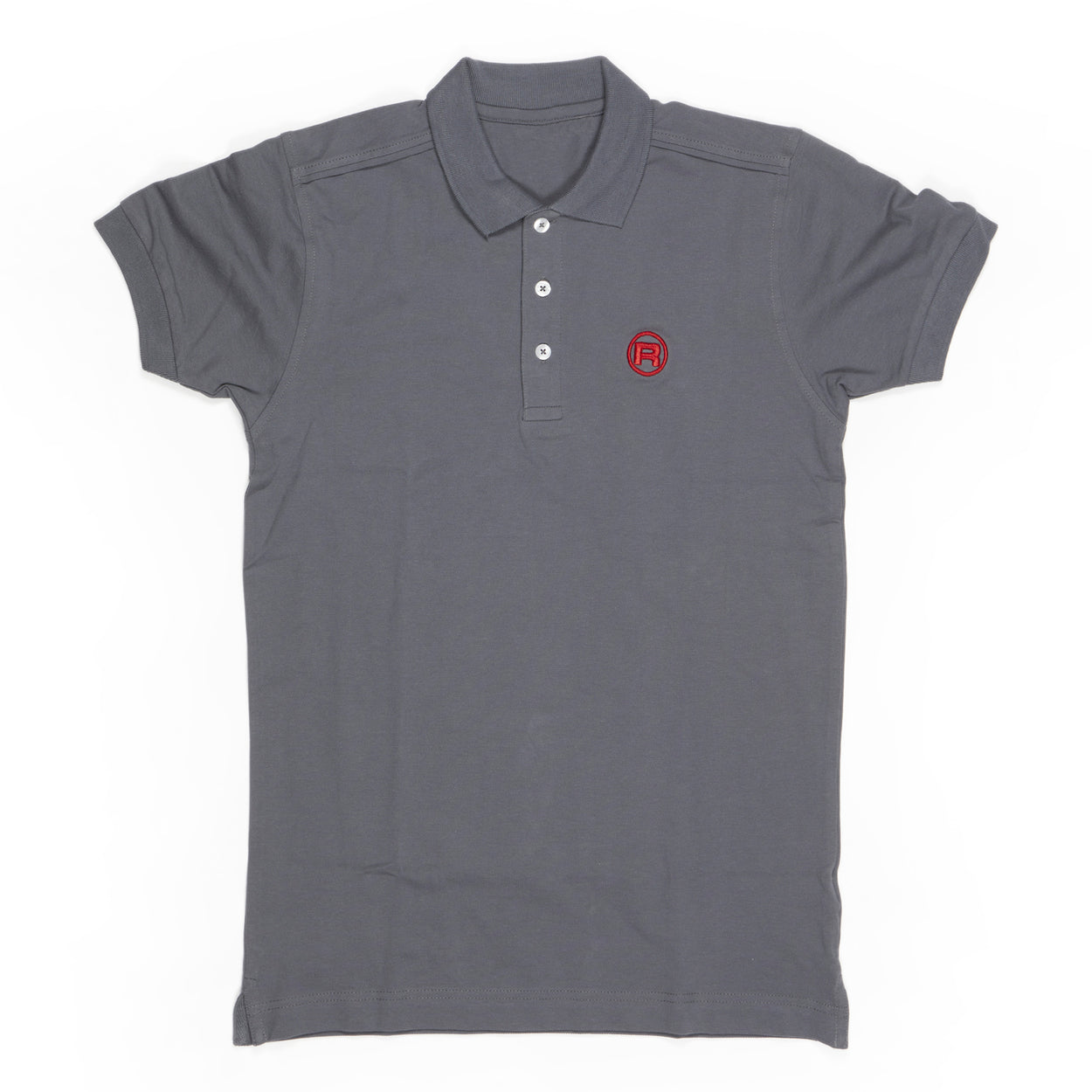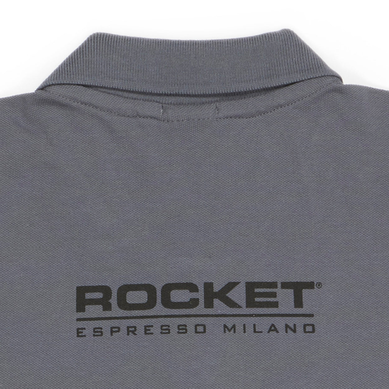 Slim-fit cotton polo shirt available in both mens and womens cuts with light gray and black color options. Embroidered red R symbol on the front and Rocket Espresso logo on the back.