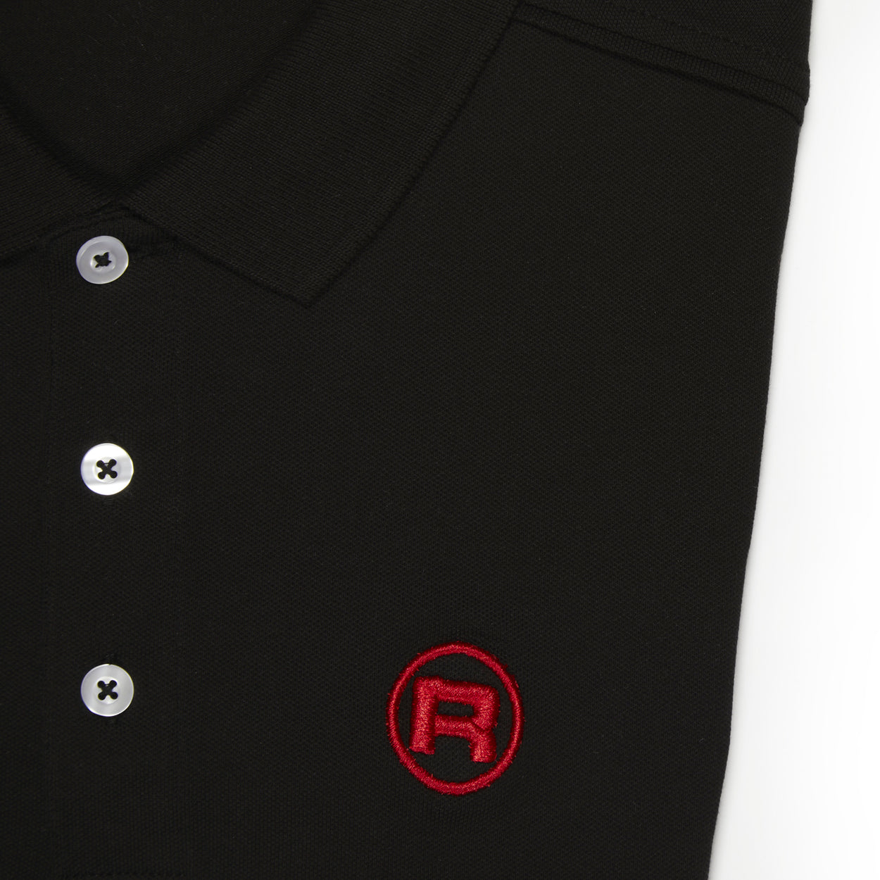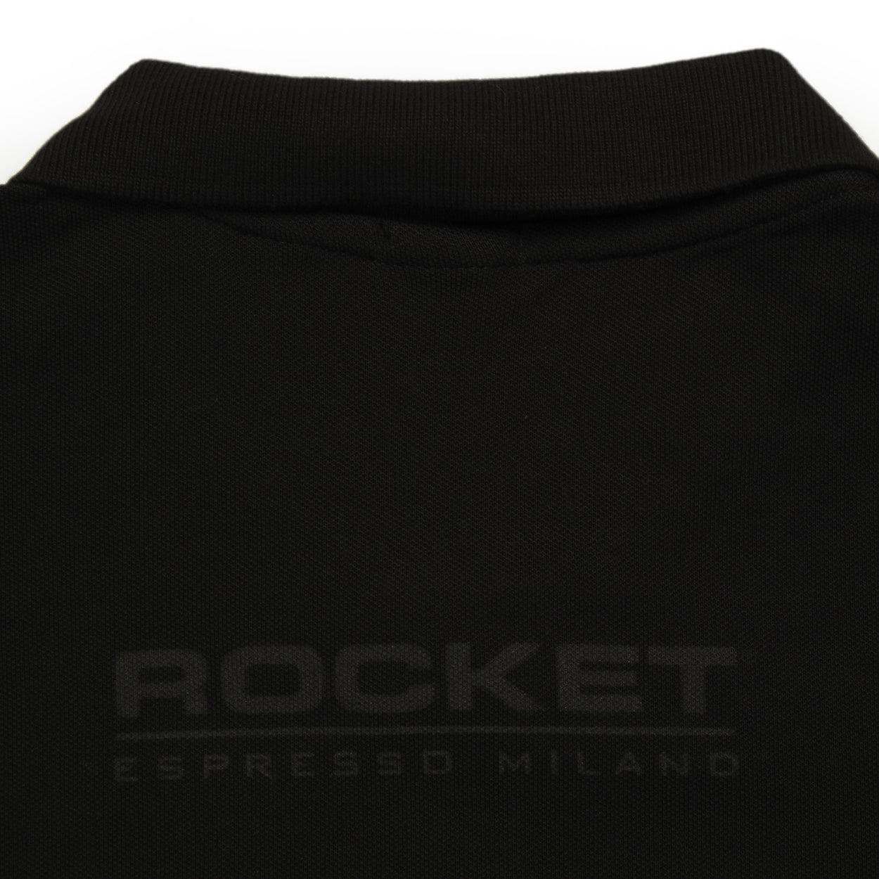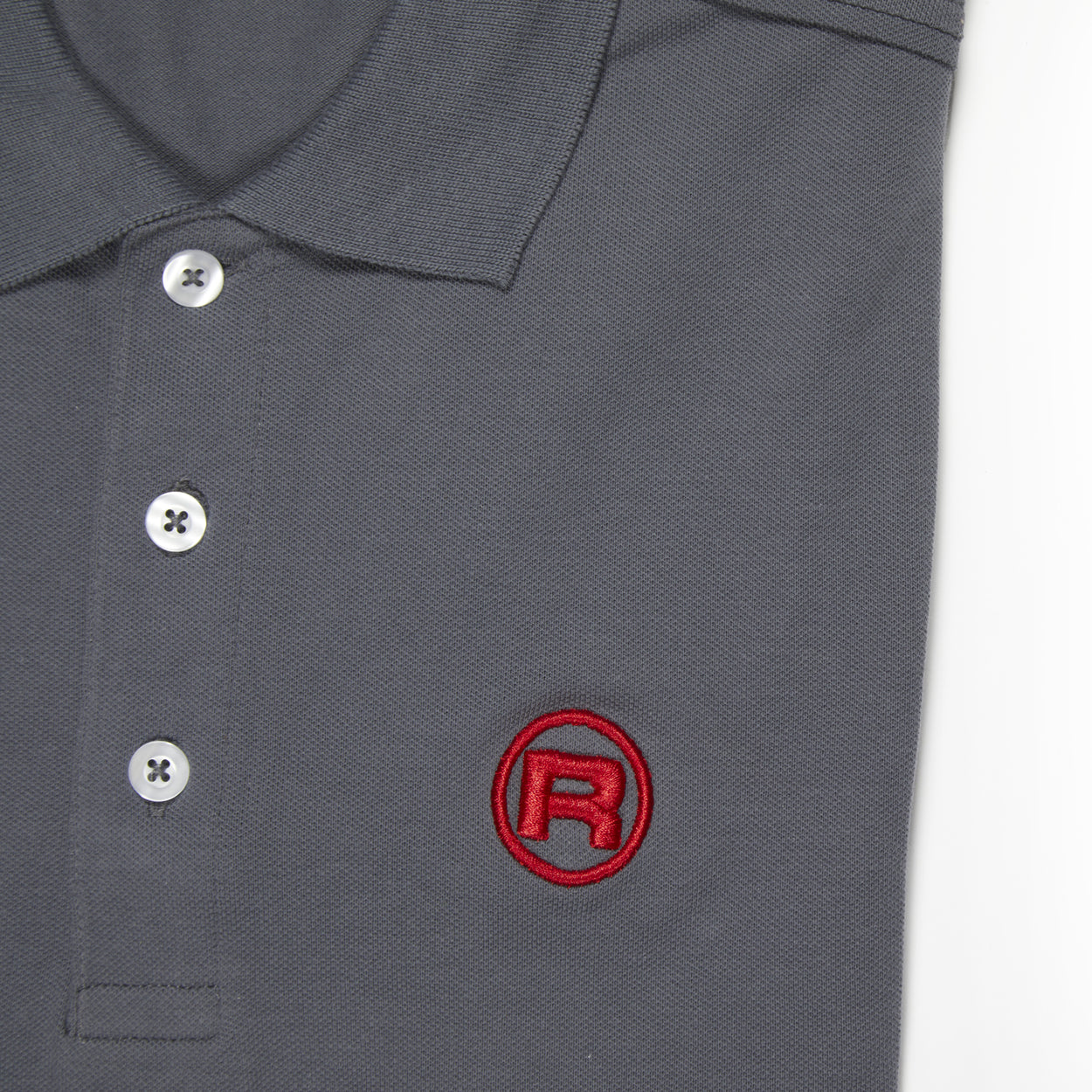 Slim-fit cotton polo shirt available in both mens and womens cuts with light gray and black color options. Embroidered red R symbol on the front and Rocket Espresso logo on the back.