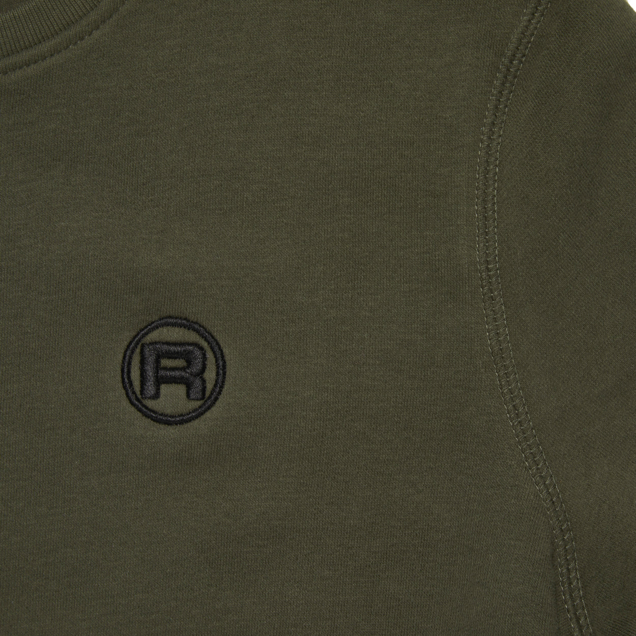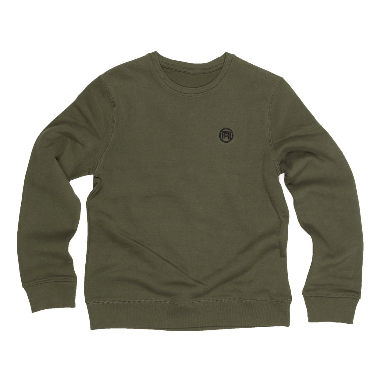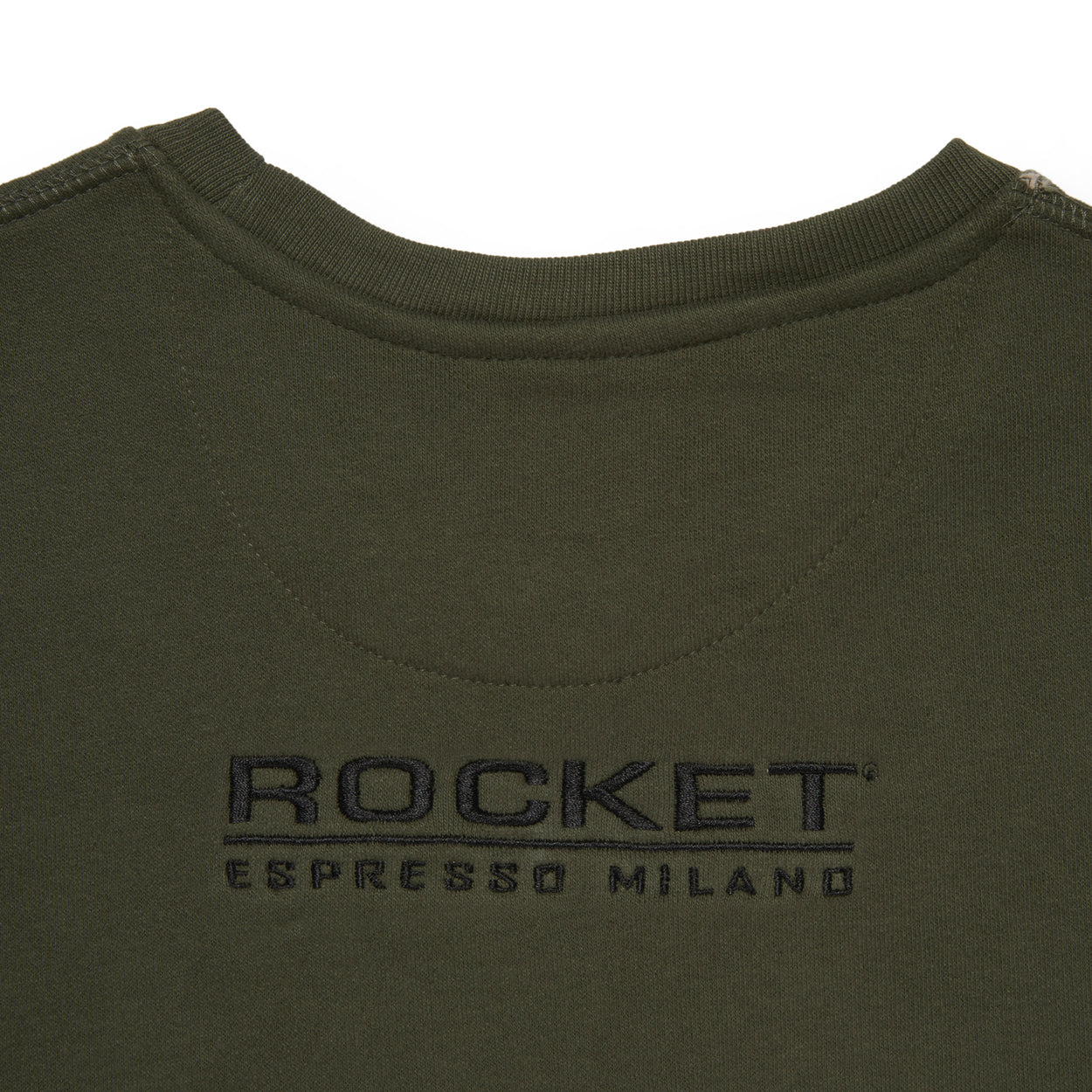 Premium quality 100% heavy knit cotton available in both womens and mens cuts. Khaki green colour with an embroidered R symbol on the front and the Rocket Espresso logo on the sweatshirt back near the low cut collar.